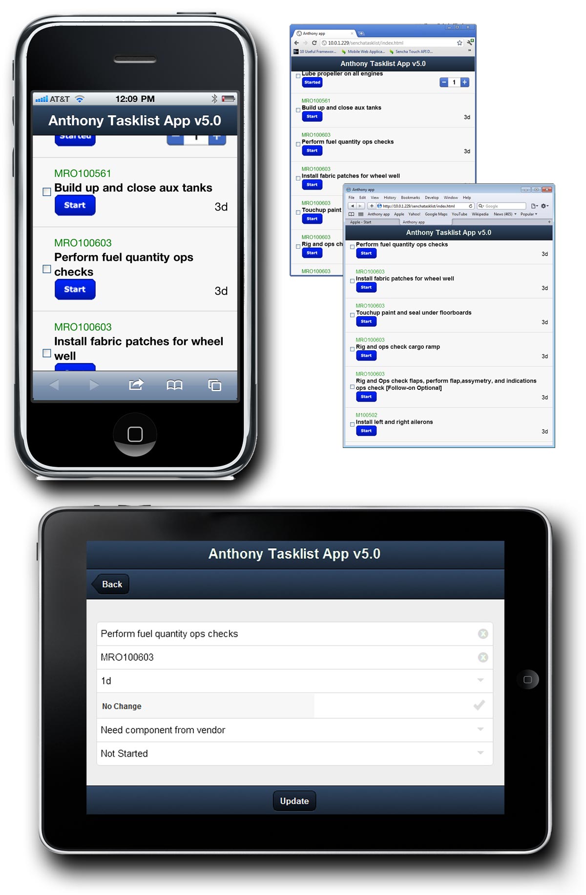 To get this started, I created a working prototype of our task list with Sencha Touch. Sencha Touch is an HTML5 framework, which makes it possible to use the same code to work on all mobile devices with a webkit browser. This prototype works on the iPhone, iPad, Google Chrome, Android and Safari. The app looks and feels more like a native app than a mobile website.
